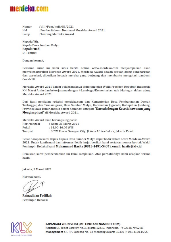 Penerimaan Penghargaan Dari Kemendesa Kepada Kepala Desa Sumbermulyo