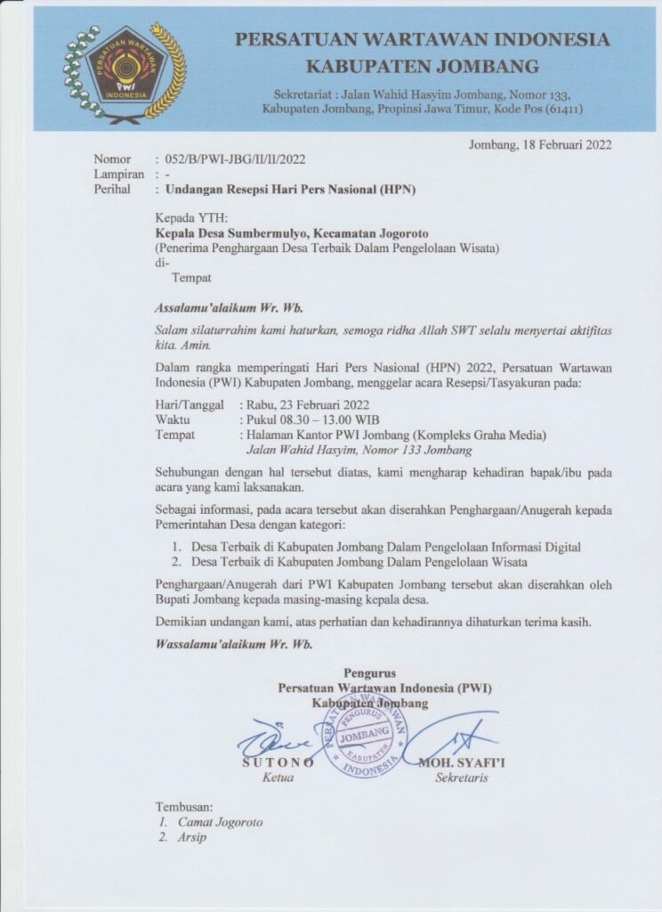 Dalam Rangka Resepsi Hari Pers Nasional (HPN) 2022 Desa Sumbermulyo atau Kepala Desa telah Menerima Penghargaan Desa Terbaik Kategori : 1. Desa Terbaik di Kabupaten Jombang Dalam Pengelolaan Informasi Digital 2. Desa Terbaik di Kabupaten Jombang Dalam Pengeloaan Wisata. Terimakasih Kepada Pemerintah Kabupaten Jombang dan Persatuan Wartawan Indonesia Kabupaten Jombang sekaligus Masyarakat Desa Sumbermulyo Atas Dukungan dan Motivasinya.