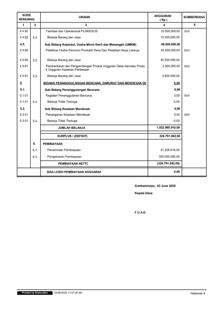 Anggaran Pendapatan Dan Belanja Desa Tahun 2020