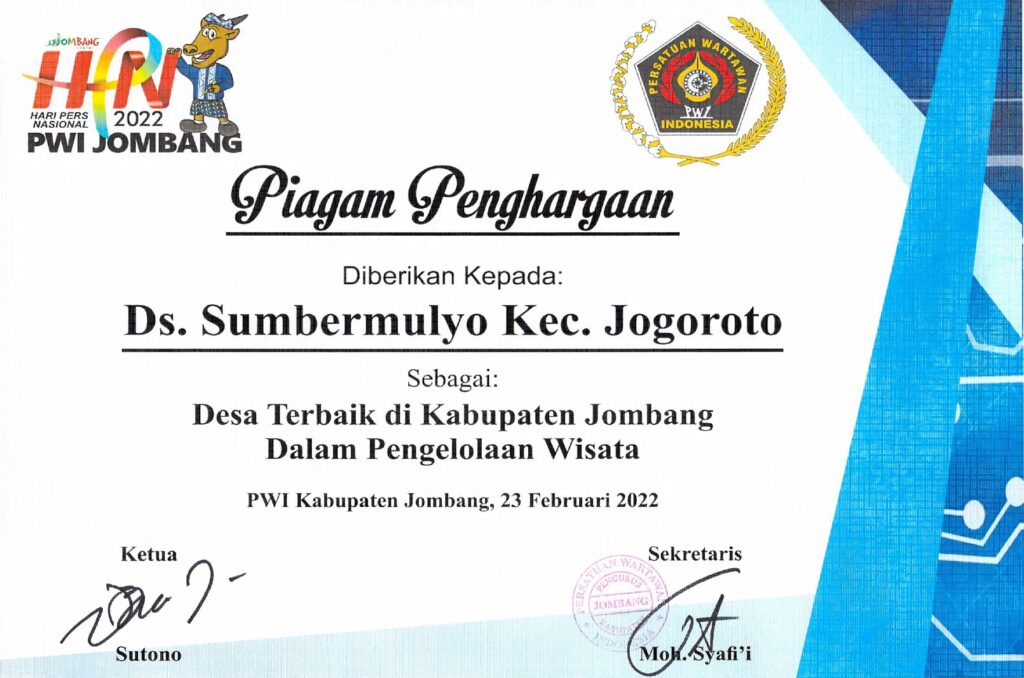 Piagam Penghargaan sebagai DESA TERBAIK Tahun 2021 di Kab. Jombang dalam PENGELOLAAN WISATA